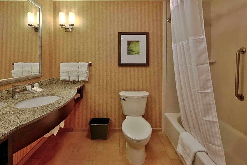 This mobility and hearing accessible standard room features one king bed, and an accessible tub with grab bar in tub with attached accessible seating, lowered vanity in bathroom, and lowered closet shelf. The room also has a visual alarm, and notification devices for the doorbell or door knock and incoming telephone calls. And the pursuit of the perfect night's stay continues with an evolution of innovative new amenities including the bed, chair, and television. The Garden Sleep System is one of the most comfortable beds you will ever experience. The ergonomic Mirra chair by Herman Miller is good for your back and better for work. Enjoy your favorite television show on our 36-inch HDTV. There's also a microwave, refrigerator and coffee/tea maker to help you feel at home. And for conducting business, our rooms ensure your productivity thanks to the spacious work desk, two telephones. Any corresponding photo may not reflect the specific accessible room type or room feature.